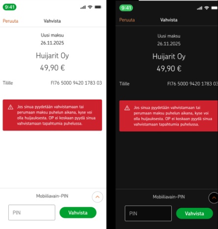 ”Jos sinua pyydetään vahvistamaan tai perumaan maksu puhelun aikana, kyse voi olla huijauksesta. OP ei koskaan pyydä sinua vahvistamaan tapahtumia puhelussa”, ilmoitus kertoo, kun maksua siirrytään vahvistamaan Mobiiliavaimella puhelun ollessa käynnissä.