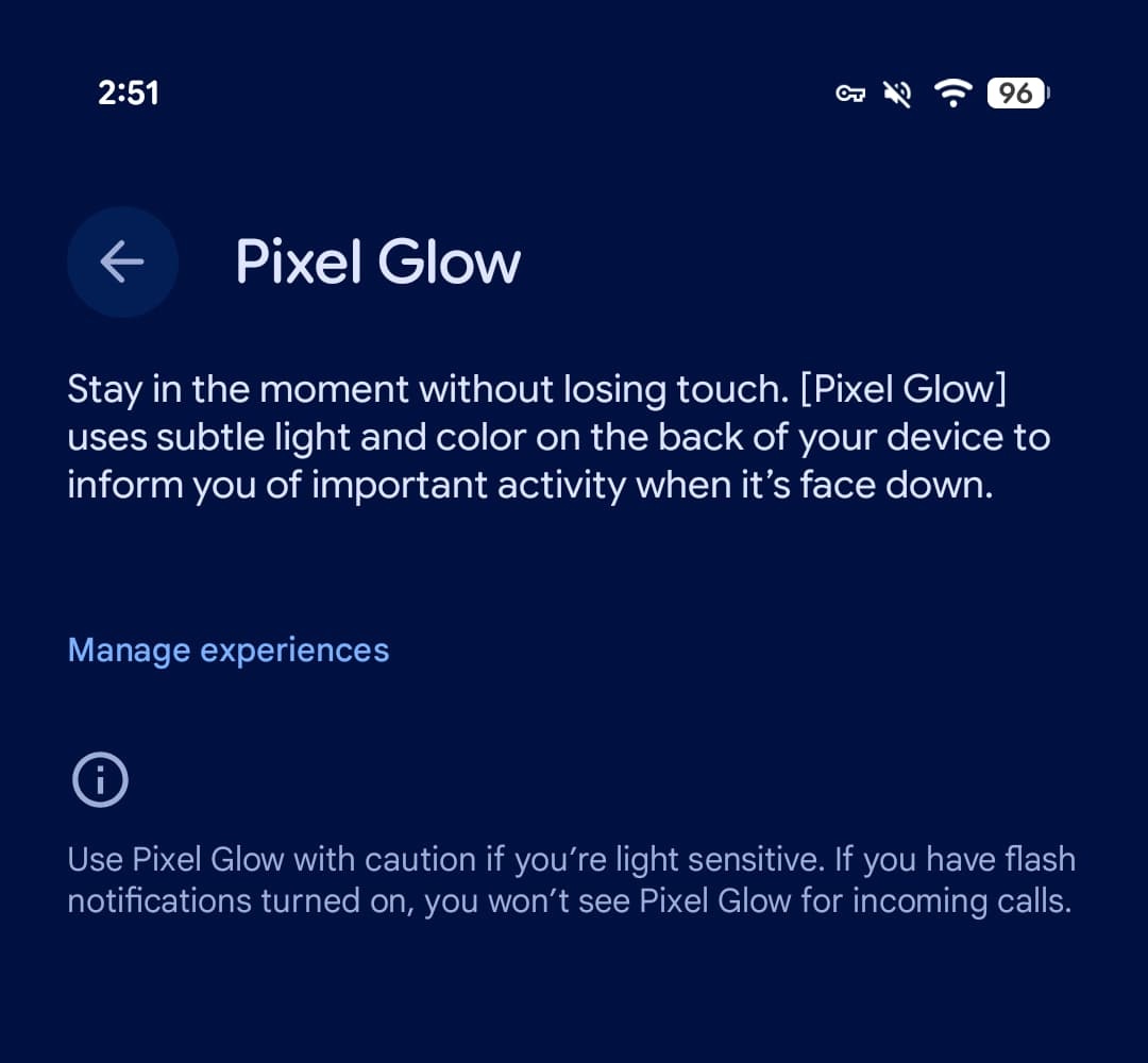 Ohjelmiston mukaan Pixel Glow ”käyttää laitteen takaosassa hienovaraista valoa ja väriä ilmoittaakseen sinulle tärkeästä toiminnasta, kun se on näyttö alaspäin.”