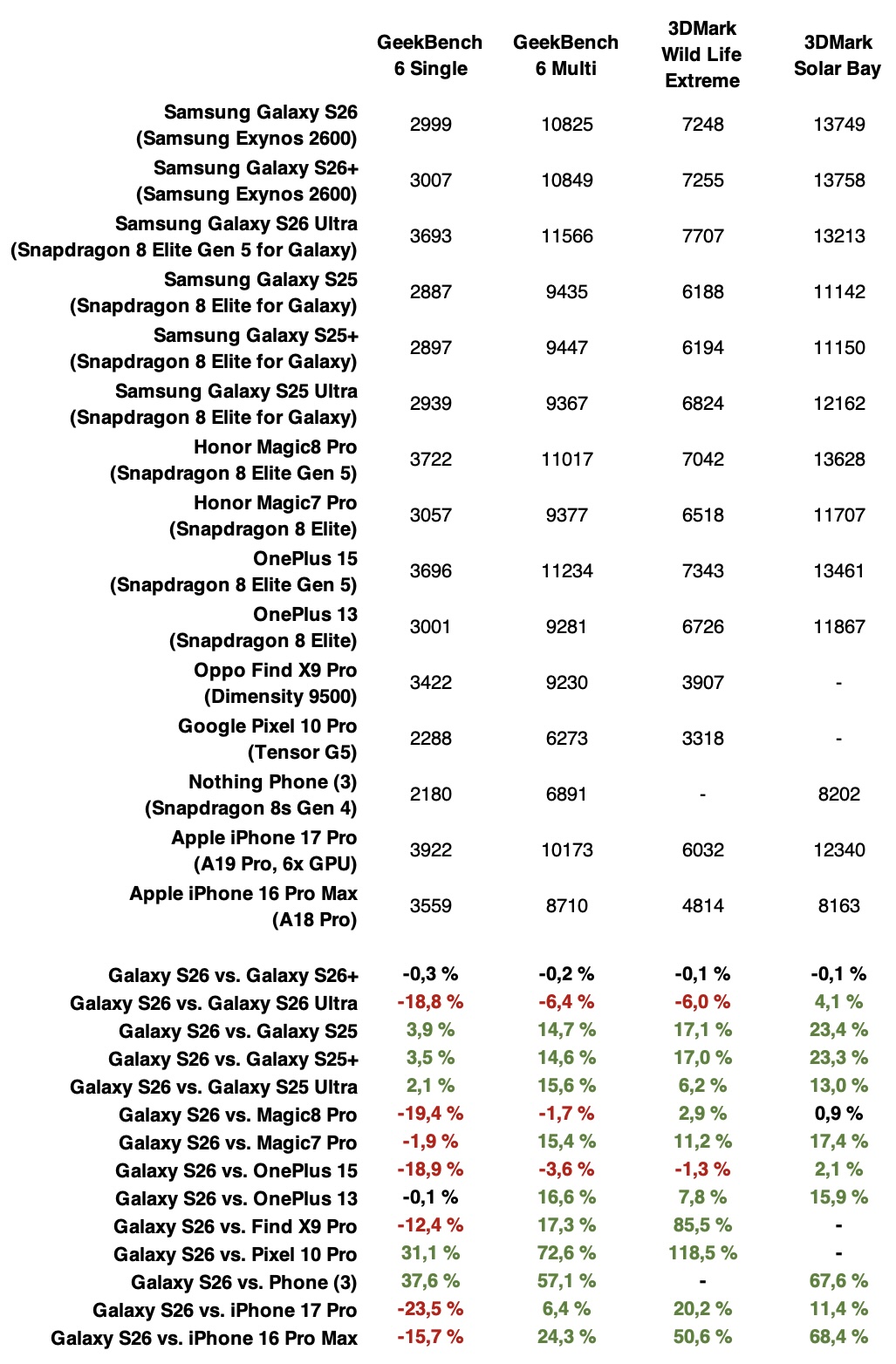 Yleisesti ottaen Exynos 2600 jää kuitenkin edelleen jälkeen Snapdragon 8 Elite Gen 5 for Galaxy -piiristä, joka on käytössä Galaxy S26 -sarjassa osassa markkinoita sekä Ultra-mallissa myös Suomessa. Erot näkyvät erityisesti suorituskykytesteissä, joissa Snapdragon venyy parempiin lukemiin. Käytännön käytössä eroja ei kuitenkaan huomaa. Galaxy S26 ja S26+ toimivat sulavasti, ja myös Galaxy AI:ta voi käyttää huoletta. Galaxy S26 ja S26+ eivät liioin lämpene käytettäessä häiritsevästi pysyen jopa viileämpinä kuin huippumalli Galaxy S26 Ultra.